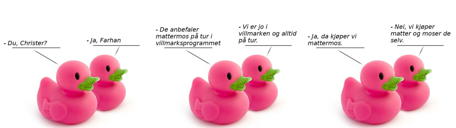 – Ja, da kjøper vi mattermos.– Nei, vi kjøper matter og moser de selv.