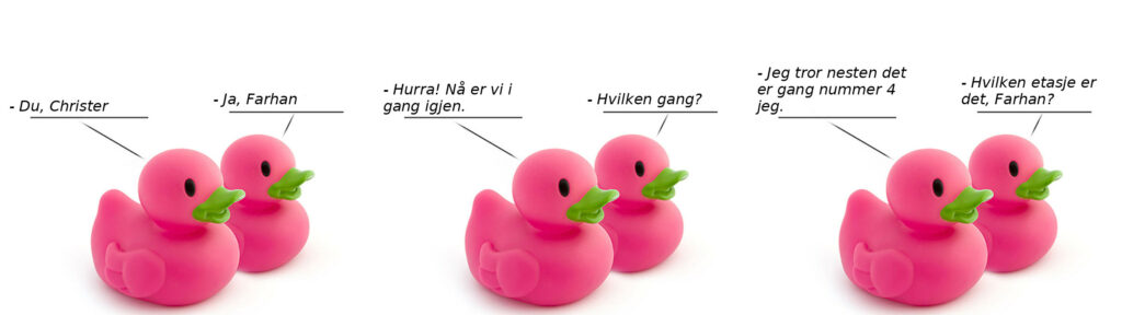 – Hurra! Nå er vi i gang igjen.– Hvilken gang?