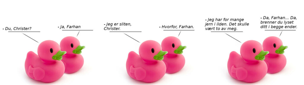 – Jeg har for mange jern i ilden. Det skulle vært to av meg.– Da, Farhan… Da, brenner du lyset ditt i begge ender.